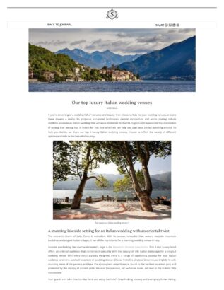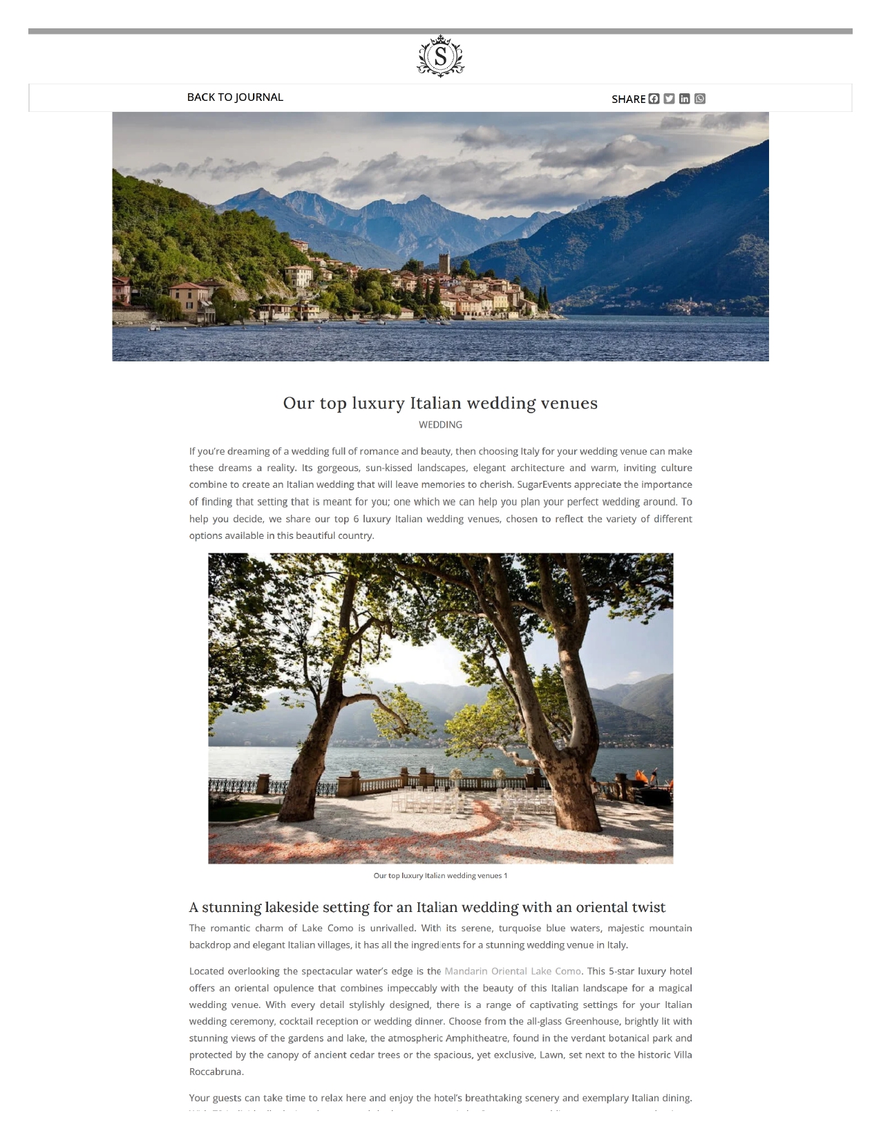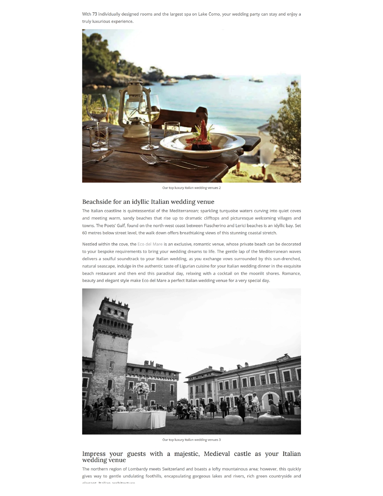 I wrote this luxury editorial feature for SugarEvents, showcasing six high-end Italian wedding venues through evocative, detailed descriptions designed to inspire couples planning a destination celebration.